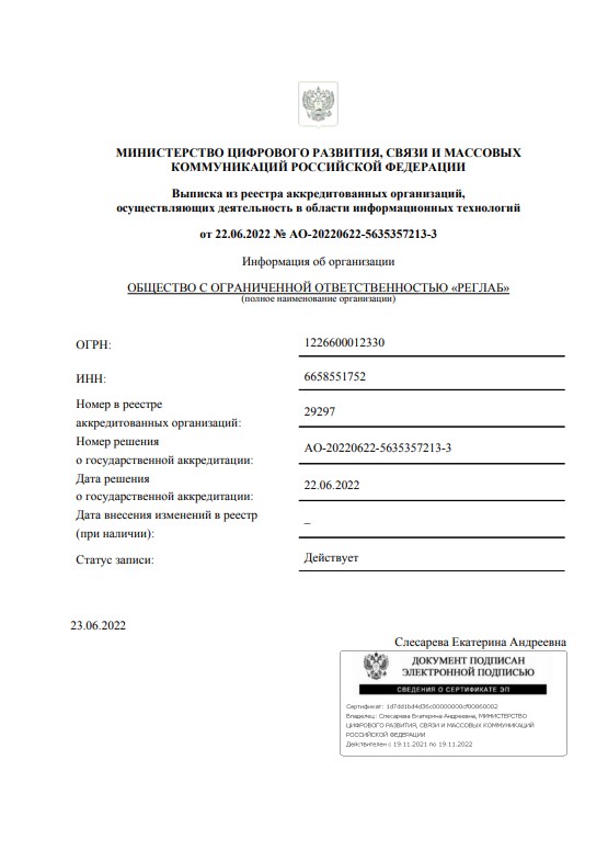 Номер в реестре аккредитованных организаций Минцифры: №67378. Решение от 22.04.2025 №АО-20250416-26153037518-3.