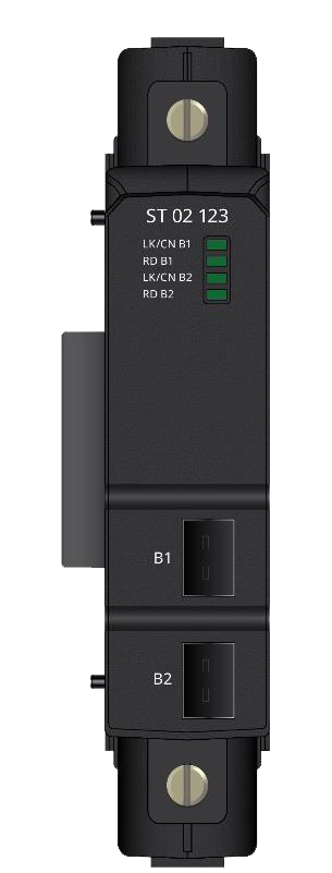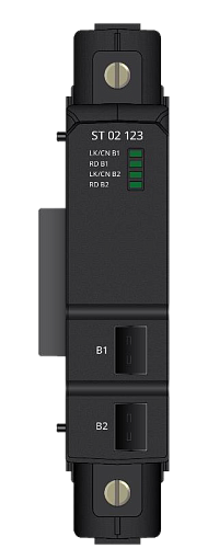 Модули с артикулом ST 02 XXX поддерживают две шины RegulBus и могут работать в резервированных системах. У этих модулей на переднюю панель выведены два разъема, которые маркируется символами «В1» и «В2», обозначающие, соответственно, первую и вторую шину RegulBus.