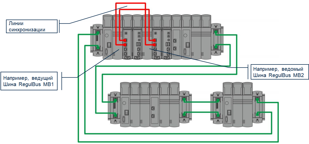 В данной схеме имеется один набор модулей ввода/вывода, который одновременно работает с двумя модулями CU. Это осуществляется благодаря тому, что в контроллере присутствуют две шины RegulBus, и модули CU производят обмен данными с модулями ввода/вывода каждый по своей шине.
