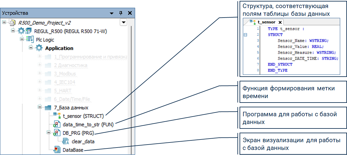Работа с базой данных будет рассмотрена на примере программных компонентов, находящихся в папке «7_База данных» демо-проекта.