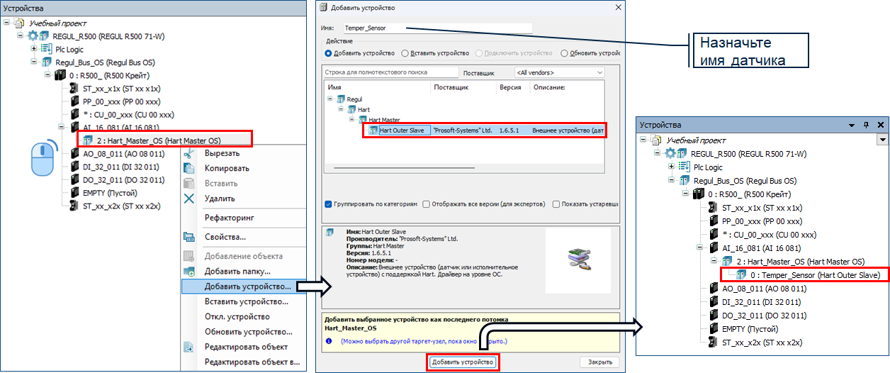 13.4. ДОБАВЛЕНИЕ HART Outer Slave 3. Добавьте к HART-мастеру внешнее slave-устройство, которое будет опрашиваться контроллером. Назначьте имя датчика.