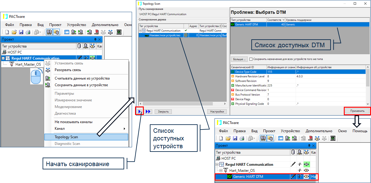13.23. ДОБАВЛЕНИЕ HART УСТРОЙСТВА ЧЕРЕЗ СКАНЕР Сканер позволяет определить все подключенные к контроллеру устройства. Добавление необходимых устройств в проект выполняется кнопкой «Применить». Сканер удобно использовать при наличии большого количества подключенных устройств.