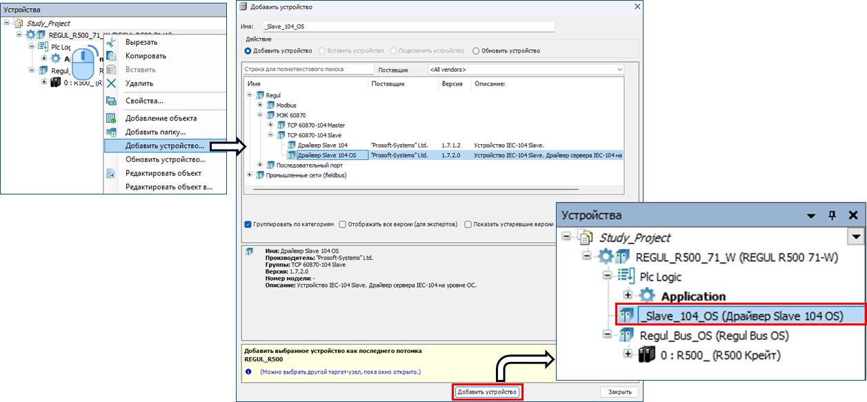 Необходимо добавить в состав дерева устройств проекта компонент «Драйвер Slave 104 OS».