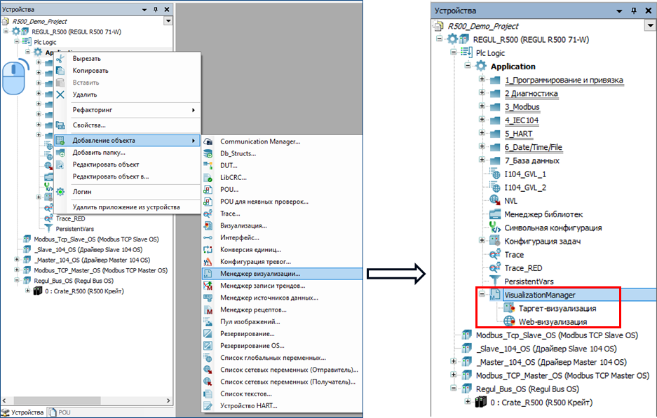 Если контроллер обладает функциональностью W, то, после добавления в состав проекта компонента «Менеджер визуализации», в его составе будут присутствовать объекты «Таргет-визуализация» и «Web-визуализация».