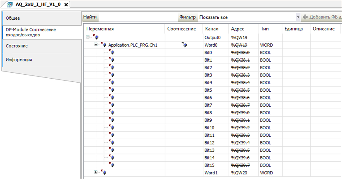 Во вкладке «DP-Module Соотнесение входов/выходов» модуля AQ 2*U/I аналоговые каналы привязываются к переменным стандартным способом.
