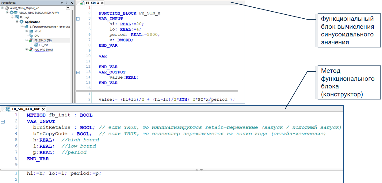 В состав функционального блока FB_SIN_X добавлен метод FB_Init (метод инициализации), который является конструктором. В нем после двух служебных переменных bInitRetains и bInCopyCode описаны пользовательские входные параметры. В параметры функционального блока FB_SIN_X кодовой части метода FB_Init присваиваются значения его параметров.