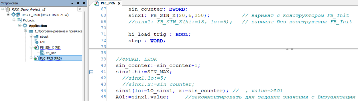 В таблице описания локальных переменных программы PLC_PRG создан экземпляр функционального блока FB_SIN_X с именем sinx1. Причем «вариант с конструктором FB_Init» подразумевает обязательное назначение параметров в скобках, в последовательности описания их в самом конструкторе. Закомментированный «вариант без конструктора FB_Init» позволяет самому пользователю при необходимости задать значения требуемых параметров в произвольной последовательности.