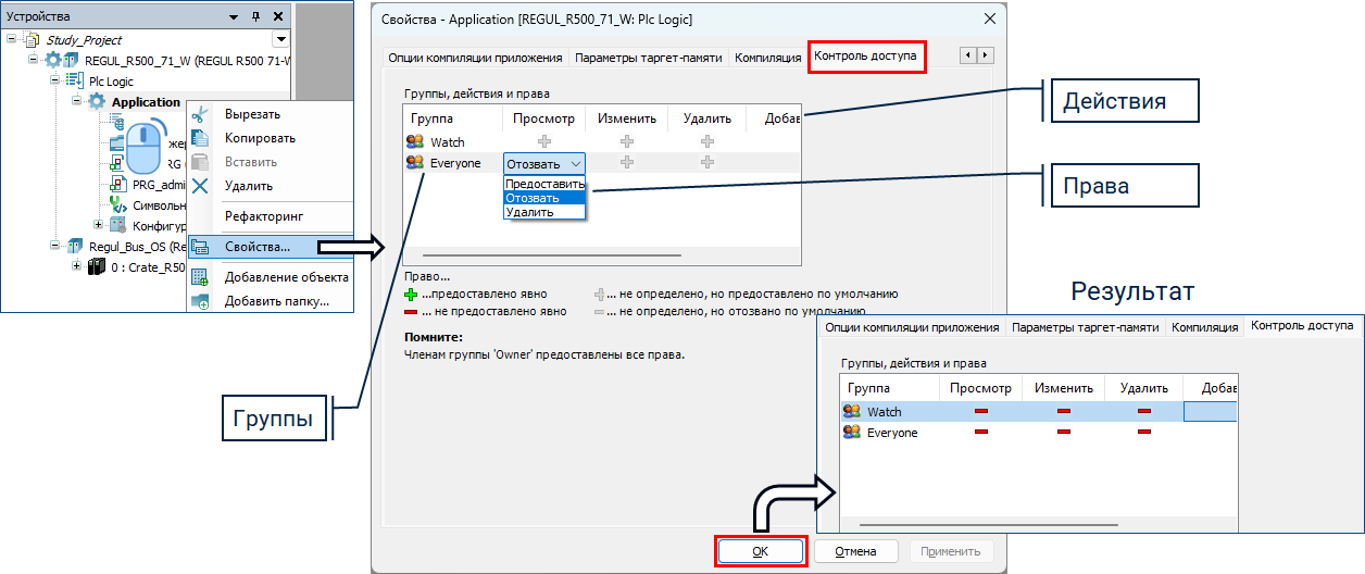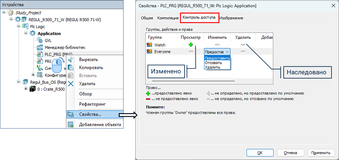 В данном примере пользователи группы «Watch» смогут только просматривать программу «PLC_PRG». Все остальные действия запрещены.