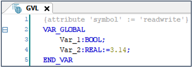 Чтобы отметить переменные в списке глобальных переменных, которые будут передаваться по протоколу OPC UA на чтение и запись, необходимо добавить атрибут {attribute 'symbol' := 'readwrite'}.