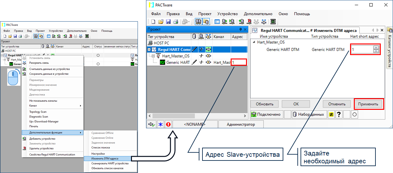 При добавлении вручную HART устройств в проект потребуется указать для них адреса. У каждого устройства (слейва), при подключении к одному мастеру, должен быть уникальный адрес. Аналогичные адреса должны быть назначены слейвам в проекте среды разработки Astra.IDE.