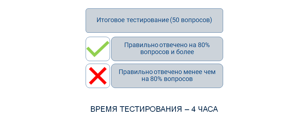 Обучающийся, не прошедший итоговую проверку знаний, может пройти повторное тестирование с последующей группой после предварительного согласования с администратором курса.