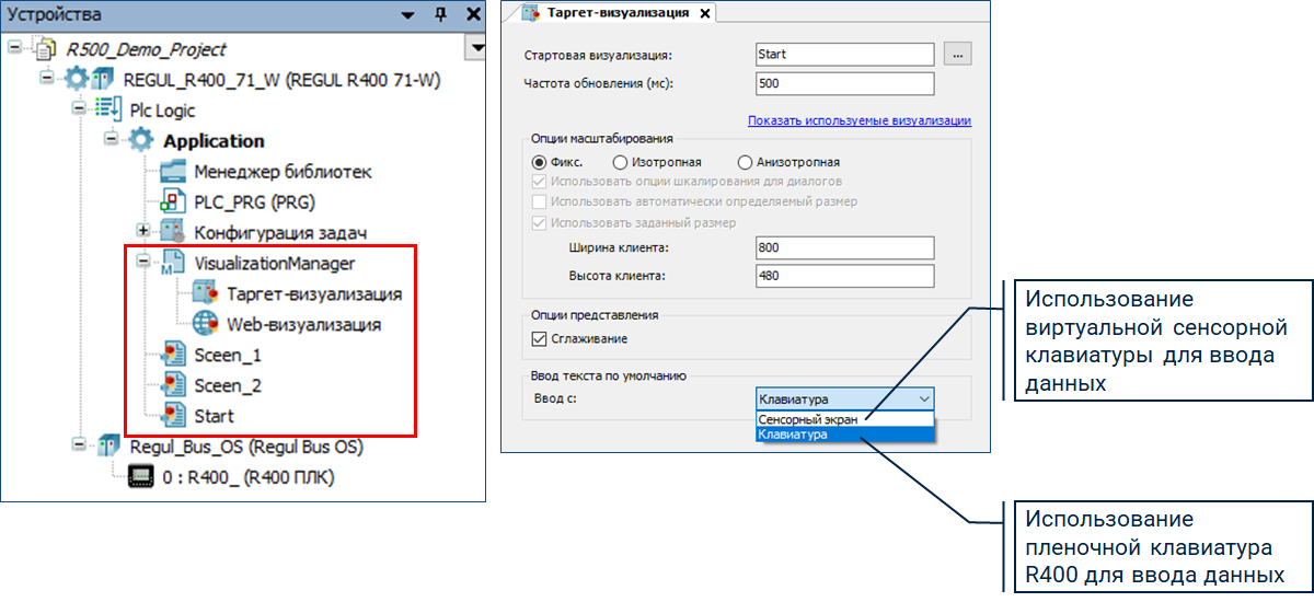 Программирование контроллера, а также настройка и конфигурирование визуализации выполняется аналогично контроллеру REGUL R500.
