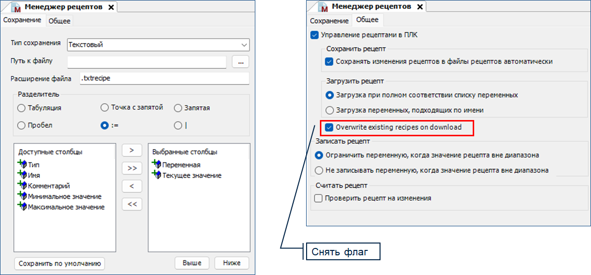 Overwrite existing recipes от download. Опция включена: на контроллере существуют файлы рецептов с таким же именем, то при запуске приложения они перезаписываются настроенными значениями из проекта. Если вместо этого следует загружать значения из существующих файлов рецептов, то эту опцию необходимо отключить.