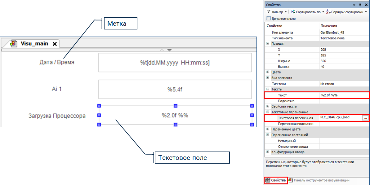 Для текстовых полей, расположенных справа от меток «Ai1» и «Загрузка Процессора», в свойстве «Текстовая переменная» привяжите переменную AI1 из списка глобальных переменных GVL и PLC_DIAG.cpu_load соответственно.
