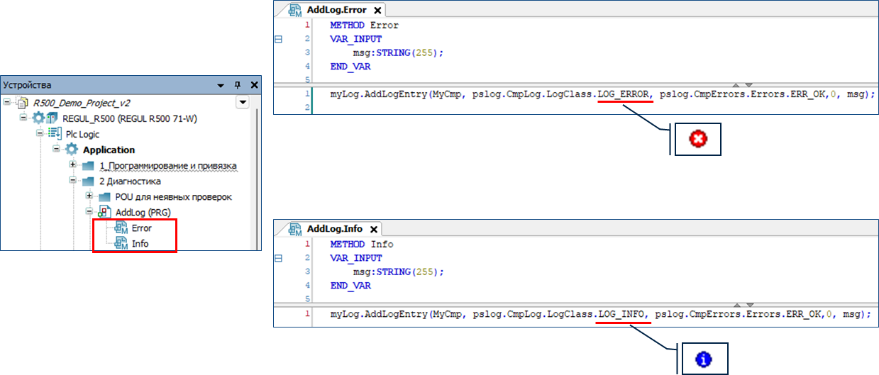 Программа AddLog содержит два метода: Error и Info. Вы можете вызывать эти методы в коде POU и записывать сообщения в журнал myLog.