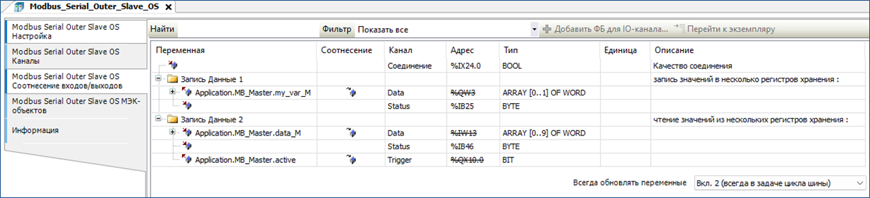 Привязка переменных к каналам Modbus выполняется во вкладе «Modbus Serial Outer Slave OS Соотнесение входов/выходов». Привязка выполняется аналогично, как это было рассмотрено ранее при настройке Modbus TCP коммуникации.