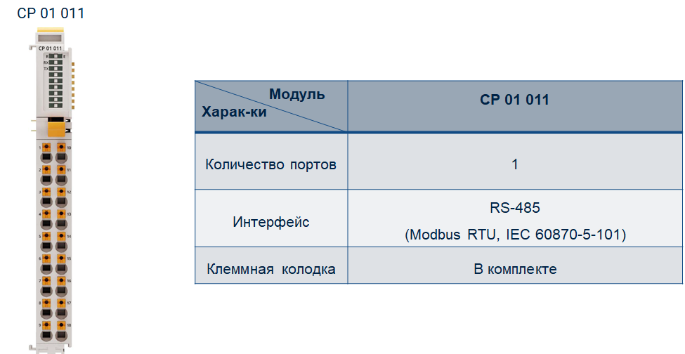 Модуль коммуникационного процессора CP 01 011 предназначен для организации независимого канала связи по интерфейсу RS-485. Модуль не содержит внутри себя драйверы протоколов. Он осуществляет физическое подключение внешних устройств. Драйверы протоколов передачи данных по этим каналам функционируют в модуле центрального процессора.