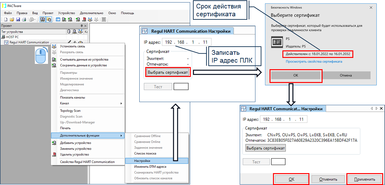 При настройке Regul HART Communication запишите IP адрес контроллера, через который выполняется подключение к датчику. По кнопке «Выбрать сертификат» открывается окно, в котором представлен срок действия сертификата. Системное время ПЛК должно быть настроено во временных рамках действия данного сертификата. После выбора сертификата и нажатия кнопки «ОК» строки «Эмитент» и «Отпечаток» заполнятся автоматически. Нажмите кнопки «Применить» и «ОК».