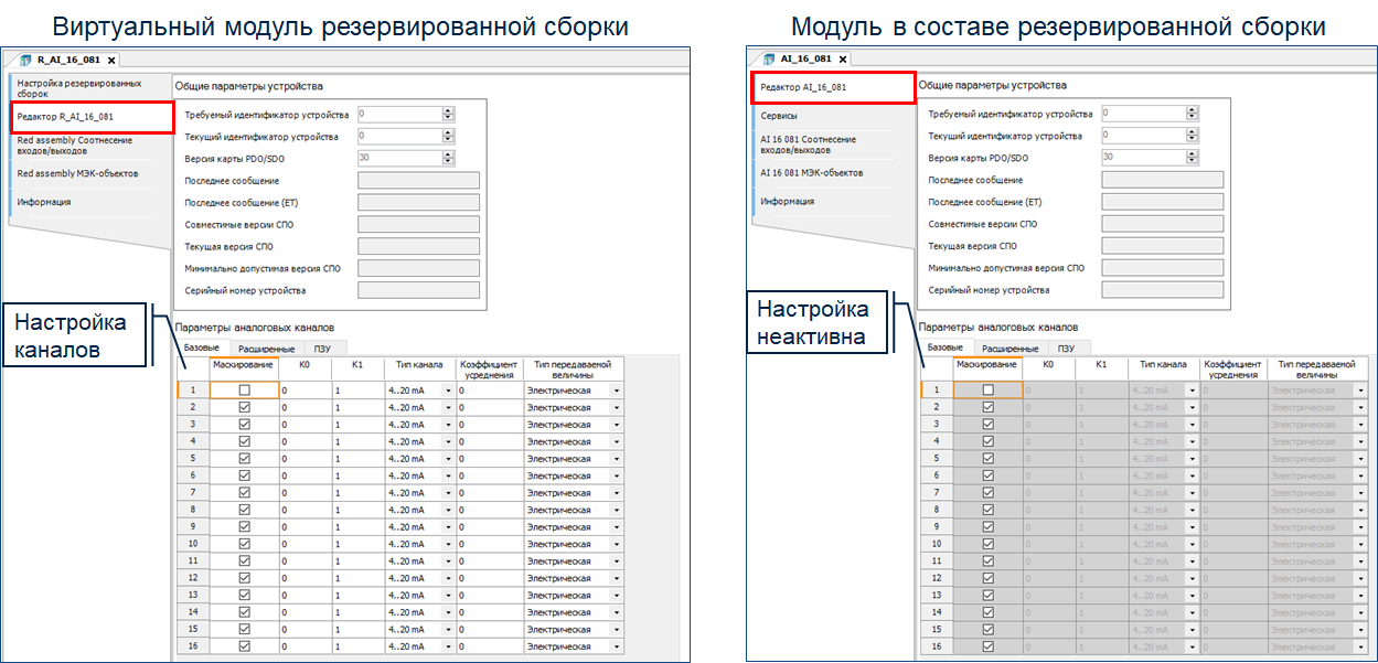 Вкладки «Редактор …» виртуального модуля резервированной сборки и реальных модулей полностью идентичны.