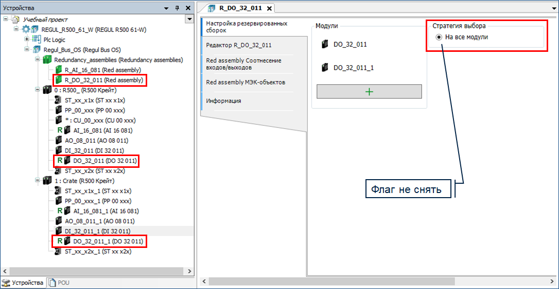 Стратегия выбора во вкладке «Настройка резервированных сборок» виртуальных модулей DO и AO идентична. Флаг «На все модули» соответствует тому, что значения переменных передаются на соответствующие каналы всех модулей резервированной сборки.