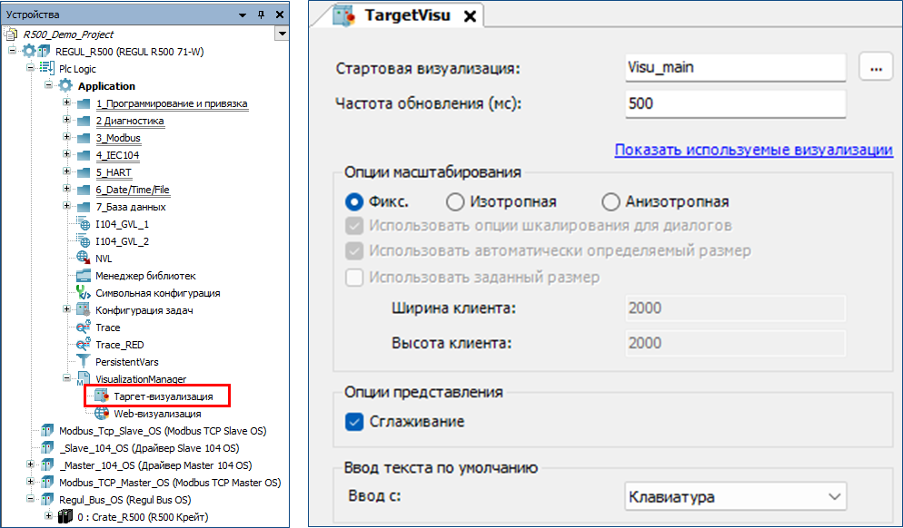 Поле «Частота обновления» – позволяет пользователю настроить частоту обновления экранов визуализации целевого устройства. Значение задается в миллисекундах.