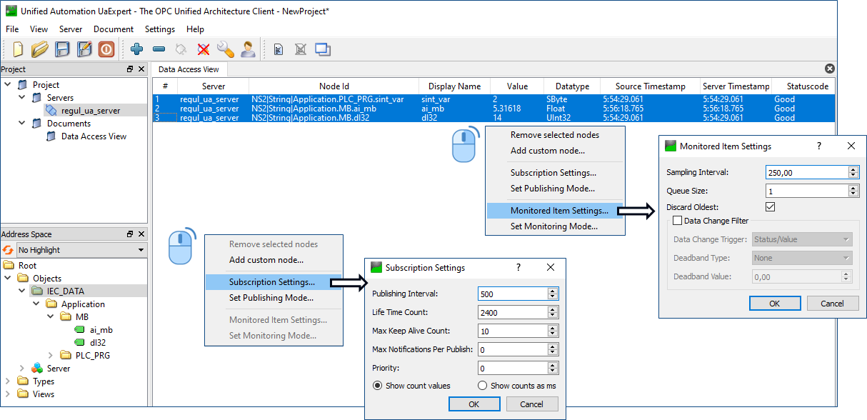 Sampling interval (интервал семплирования) - частота обновления данных внутри OPC UA сервера или интервал опроса переменных. От него зависит загрузка модуля CU контроллера. Этот интервал можно задавать отдельно каждому тегу или группе тегов. Минимальный поддерживаемый интервал составляет 50мс.