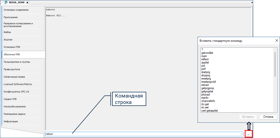 Через командную строку во вкладке «Оболочка ПЛК» посылается команда контроллеру.