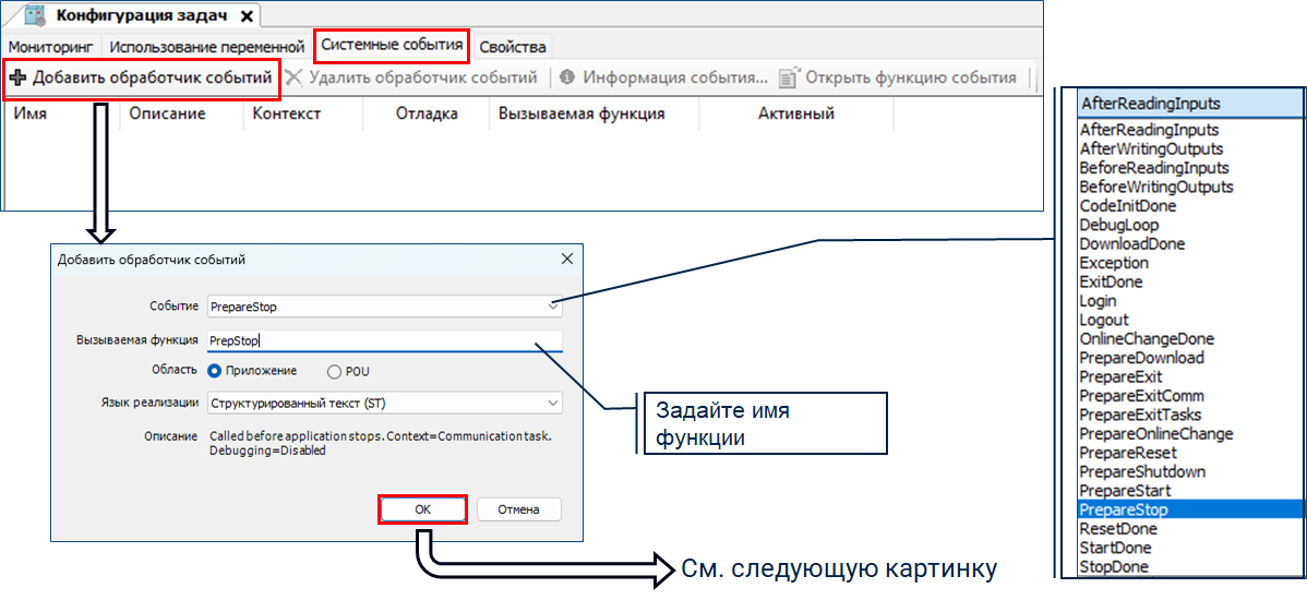 Функция «PrepareStop» будет выполняться однократно перед каждым переходом модуля CU в состояние Stop.