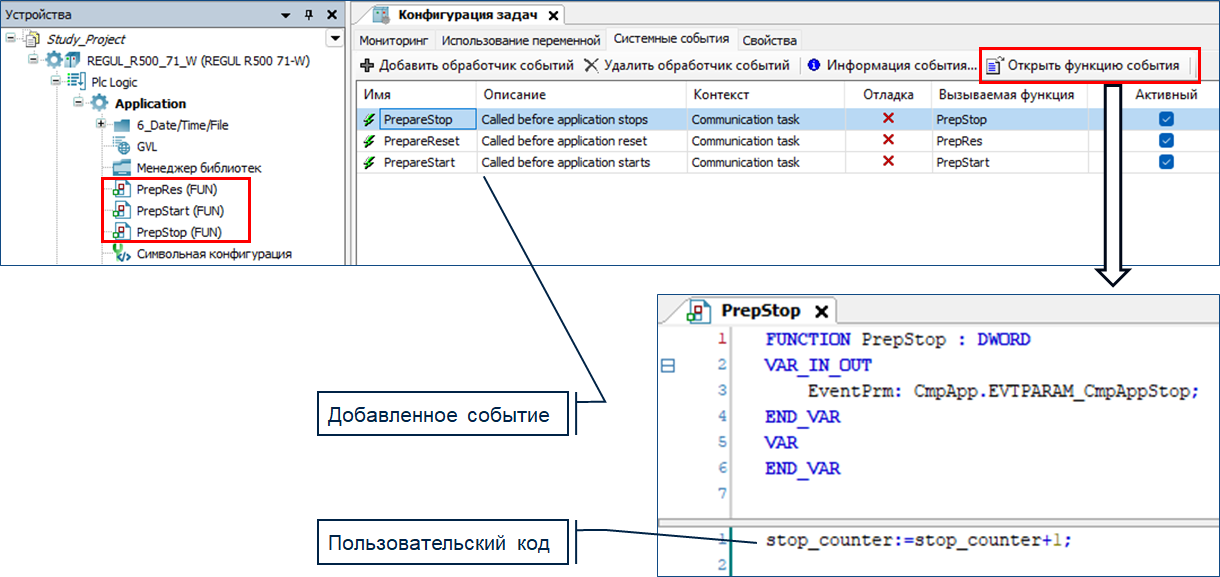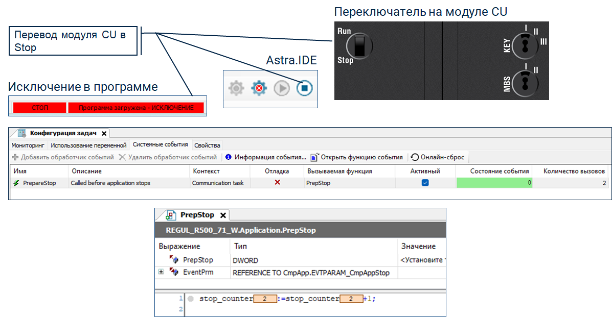 Каждый раз перед переходом модуля CU в состояние Stop, однократно выполнится функция «PrepStop» и переменная stop_counter будет увеличиваться на 1.