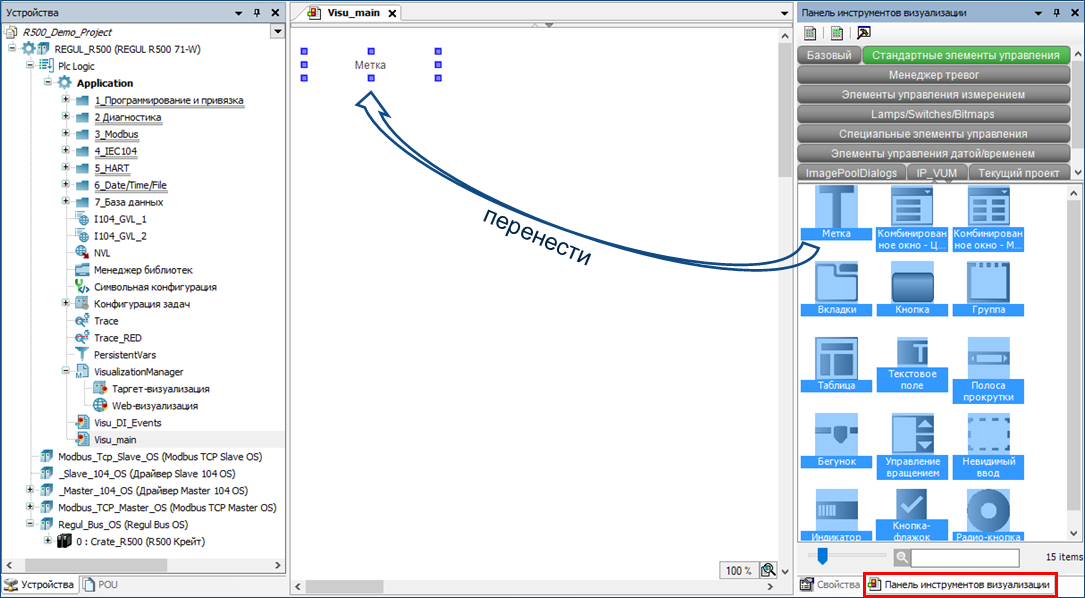В панели инструментов визуализации находятся графические элементы, объединенные по функциональности в группы. Необходимые элементы из панели инструментов визуализации можно перенести на поле экрана. Им можно придать необходимые размеры, место положения на поле и настроить свойства.