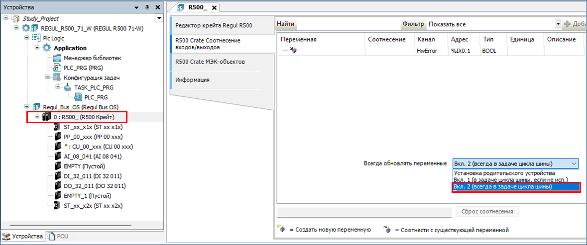 Во вкладке «R500 Crate соотнесение входов/выходов» в поле «Всегда обновлять переменные» выберите вариант «Вкл. 2 (всегда в задаче цикла шины)». Все дочерние устройства, в том числе и модули ввода/вывода контроллера, примут данную настройку.