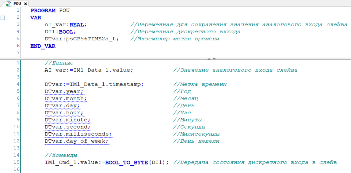 В переменной AI_var сохраняется значение переменной IM1_Data_1.value, в которую передается из Slave-устройства значение с входа модуля аналогового ввода.