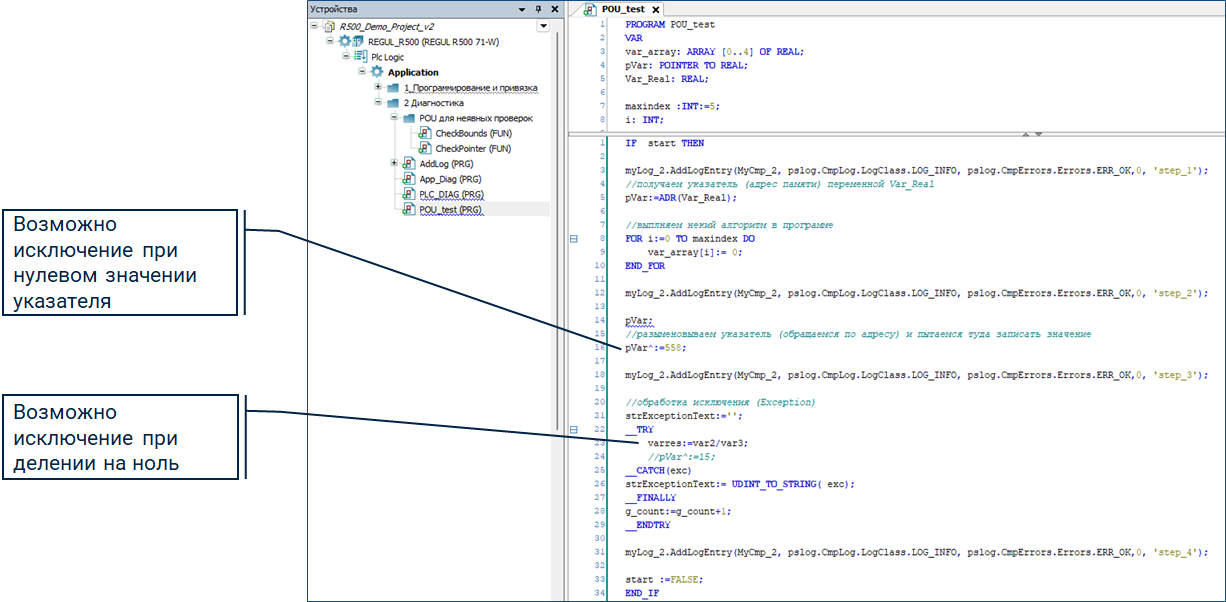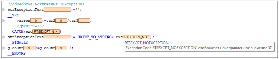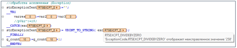 Когда оператор в __TRY вызывает исключение (в программе POU_test – это деление на ноль), приложение не останавливается. Вместо этого приложение выполняет операторы в __CATCH, запускает обработку исключений и затем выполняет операторы в __FINALLY. Обработка исключения заканчивается на __ENDTRY, а приложение выполняет последующие операторы.