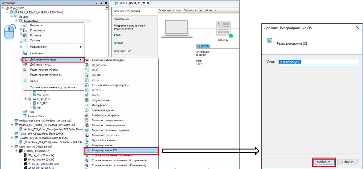 20.1.6. РАБОТА СТЕНДОВ В РЕЖИМЕ ПОЛНОГО РЕЗЕРВИРОВАНИЯ ПЛК. ДОБАВЛЕНИЕ КОМПОНЕНТА RedundancyOS В приложение проекта добавьте компонент «Резервирование OS».