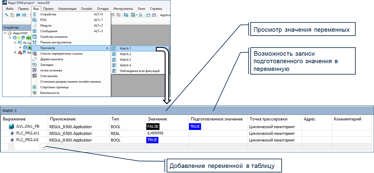 4.31. РАБОТА В ТАБЛИЦЕ Watch Таблица «Watch» может использоваться для просмотра значений добавленных в неё переменных, а также для их изменения. Изменять значения переменных можно используя команды «Записать значения (Ctrl+F7)» или «Фиксировать значения (F7)».