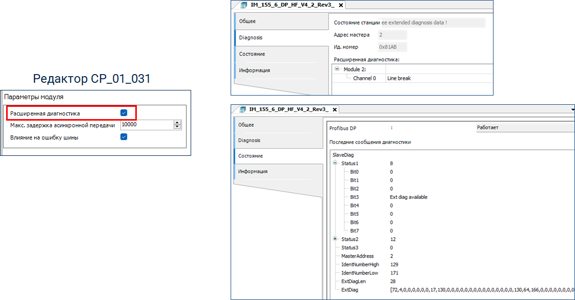 Расширенная диагностика - установка флага позволяет включить режим обновления диагностической информации сконфигурированных ведомых устройств. Полученная диагностическая информация будет доступна на вкладках: Состояние (представляет информацию в исходном виде) и Diagnosis (представляет информацию в отформатированном и доступном для чтения пользователю виде). Расширенная диагностика предоставляет информацию о текущем состоянии ведомого устройства согласно спецификации PROFIBUS DP (IEC 61158-6).