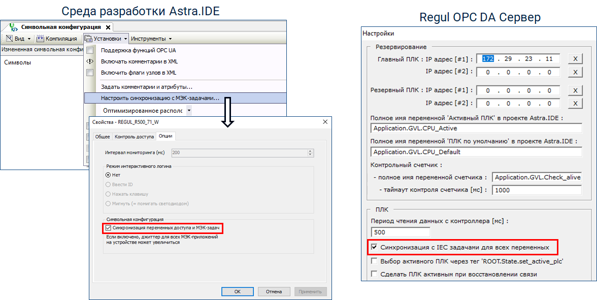 активировать флаг «Синхронизация с IEC задачами для всех переменных» в окне «Настройки» Regul OPC DA сервера;