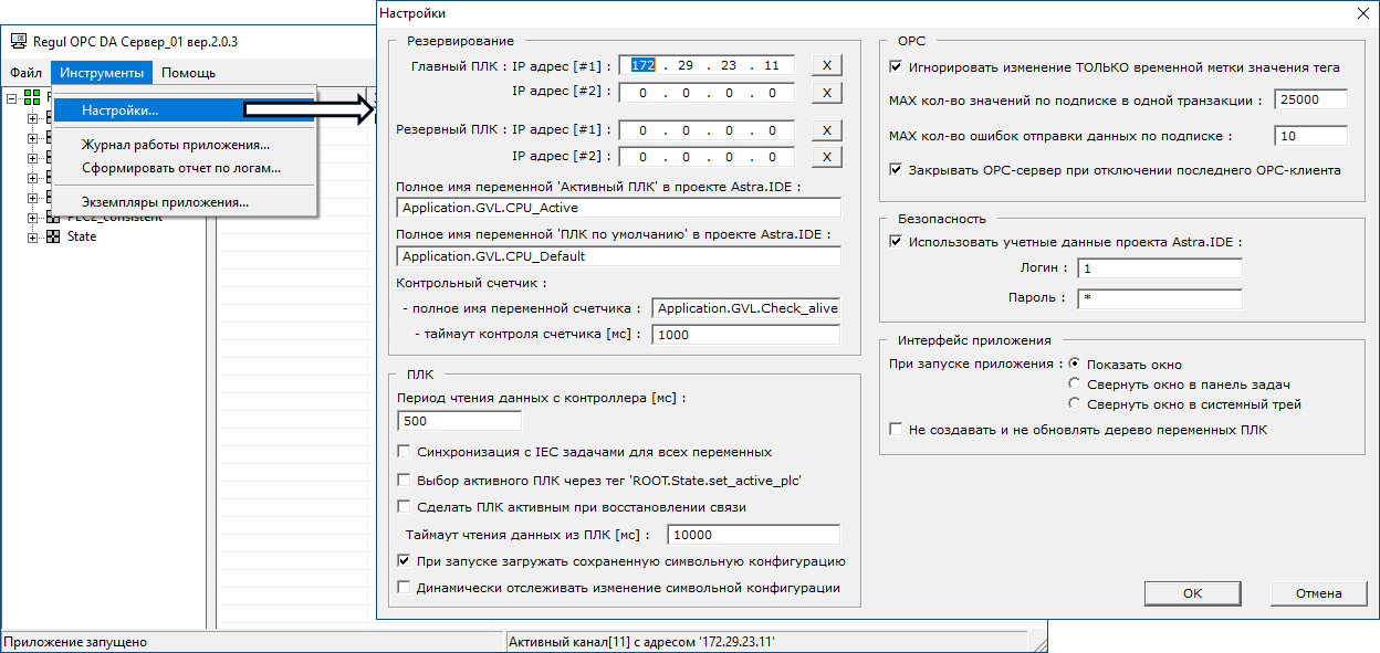 В поле «Резервирование» окна «Настройки» необходимо назначить адрес ПЛК, к которому будет подключаться Regul OPC DA Сервер. Подключение может выполняться к резервированному контроллеру и в этом случае задаются IP адреса обоих ПЛК, причем связь может выполняться с каждым модулем CU контроллера через один или два интерфейса Ethernet.