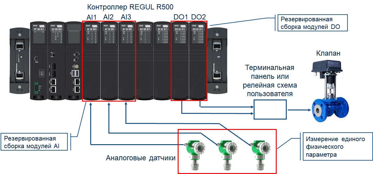 Начиная с версии СПО 1.7.1.0, в контроллерах REGUL R500 реализована поддержка резервированных сборок модулей ввода/вывода (AI, DI, AO, DO, AS, DS) с версией СПО 1.0.30.0 на шине RegulBus OS. Дополнительную информацию по ограничениям смотрите в документе «REGUL R500. Системное руководство».