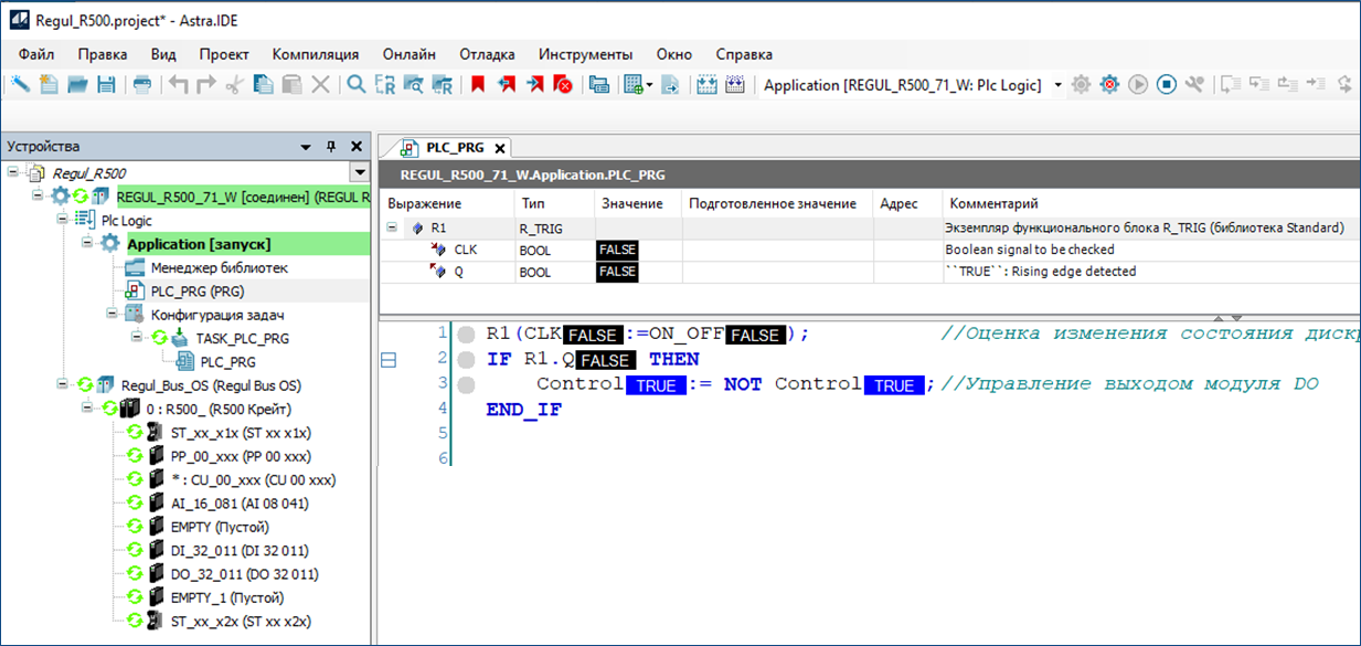 В режиме онлайн можно наблюдать за аппаратной частью ПЛК, состоянием переменных, и выполнением программы.