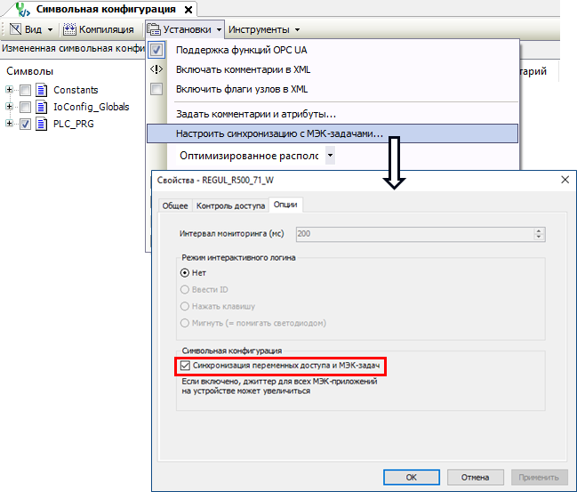 - Активируйте флаг "Синхронизации переменных доступа и МЭК-задач" в окне "Свойства".