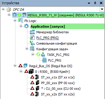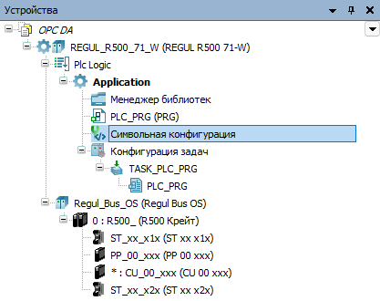 В проекте добавьте компонент "Символьная конфигурация", виртуального ПЛК REGUL_R500_71_W.
