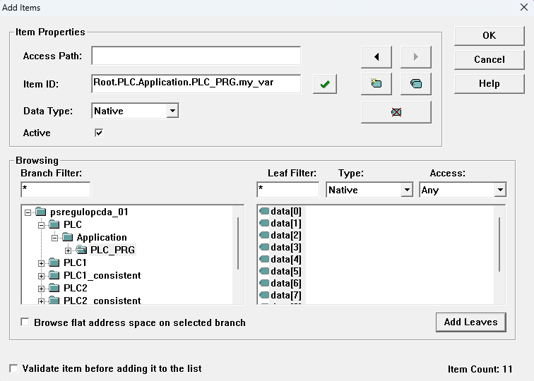 Добавьте в приложении OPC Quick Client необходимые переменные, выбирая их в окне "Add Items".