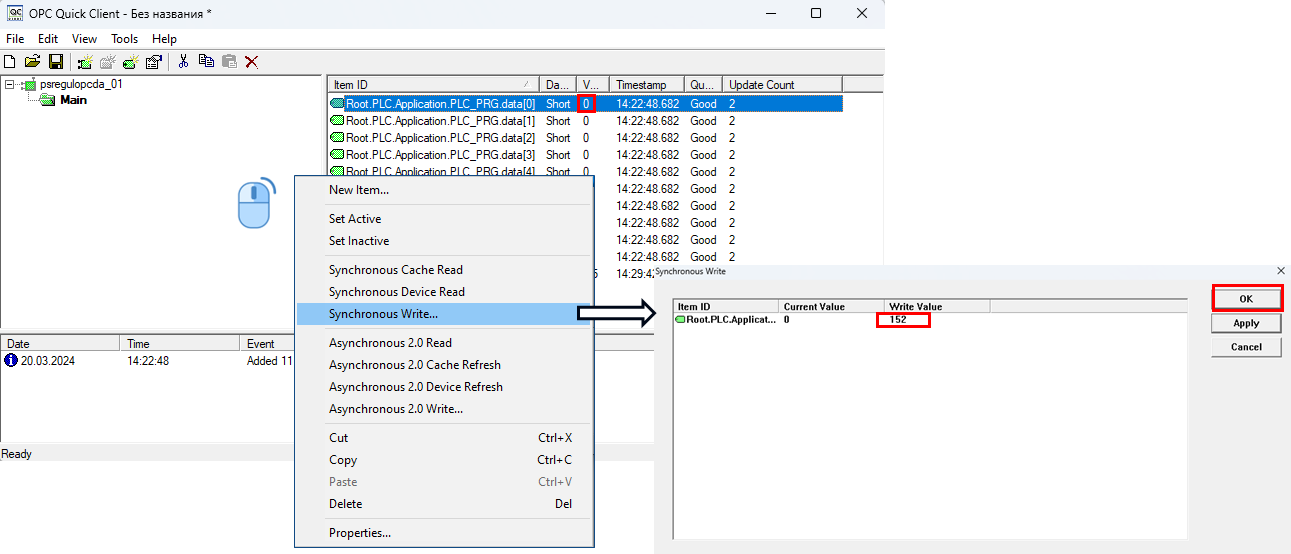 Запишите значения в массив переменной "data". Для записи переменной в ПЛК откройте окно "Synchronous Write", задайте необходимое значение в поле "Write Value", нажмите кнопку "OK".