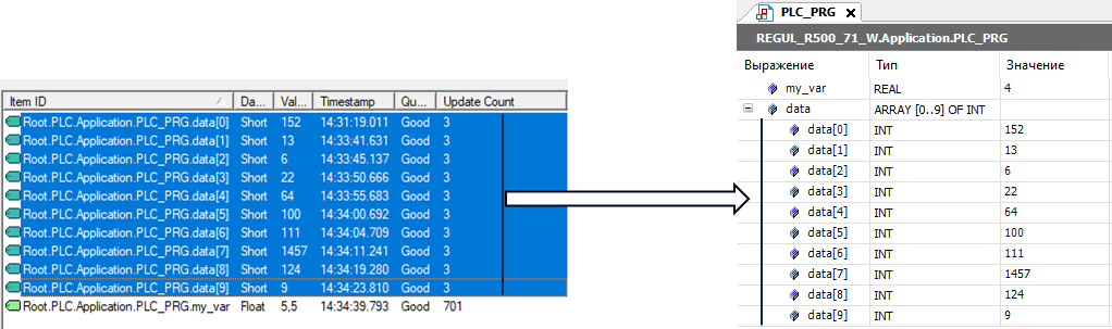 Проверьте, что значение переменной "my_var" передается в OPC Quick Client.