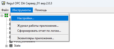 Запустите утилиту REGUL OPC DA Server и перейдите в раздел "Инструменты". В разделе "Инструменты" выберете пункт "Настройки".