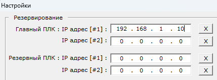 Перейдите в поле "Резервирование" окна "Настройки" и в пункте "Главный ПЛК: IP адрес [#1]" задайте IP своего виртуального контроллера.