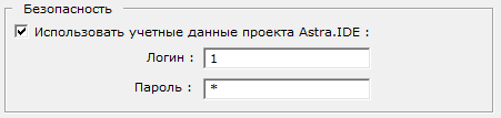 Перейдите в поле безопасность и установите флаг «Использовать учетные данные проекта Astra.IDE» и укажите логин, пароль доступа к ПЛК, который был задан через среду разработки Astra.IDE.