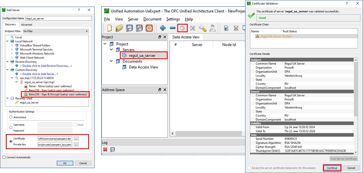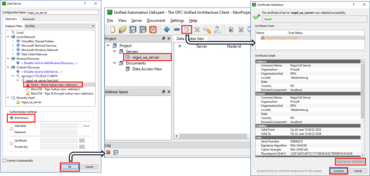 • Выполните анонимный способ авторизации в добавленном сервере. При первом подключении к контроллеру клиент UaExpert запросит доверительный сертификат с сервера. При этом откроется окно "Certificate Validation", в котором нажмите кнопку "Trust Server Certificate" и автоматически сертификат сервера перейдет в список доверенных сертификатов клиента.