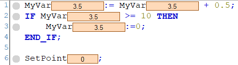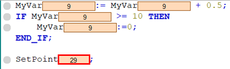 • Проверьте выполнение кода в программе "PLC_PRG". Переменная "SetPoint" должна иметь значение 0. Значение переменной "MyVar" изменяется раз в секунду.